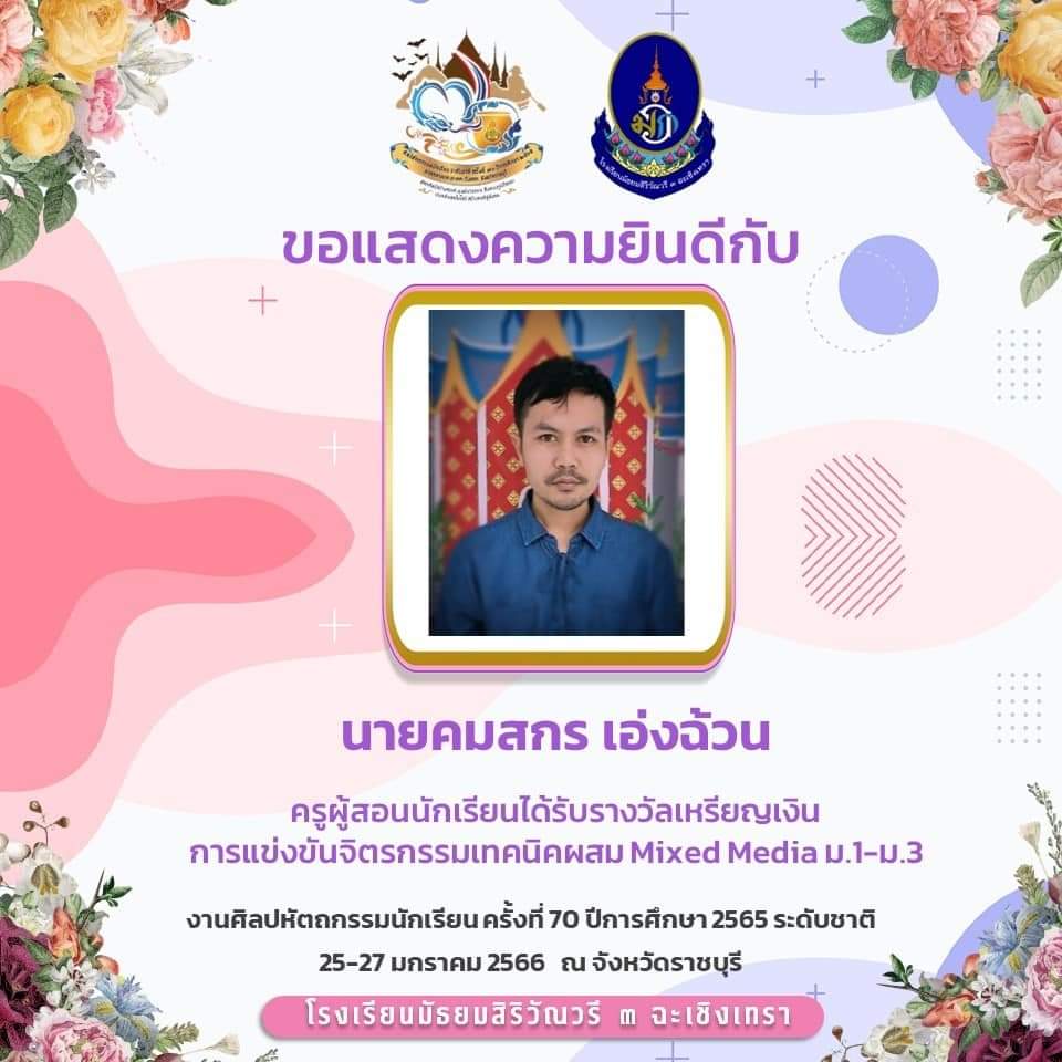 ขอแสดงความยินดีกับนักเรียนและครูผู้สอนที่ได้รับรางวัลเหรียญเงินในการแข่งขันรายการจิตรกรรมเทคนิคผสม Mixed Media ระดับชั้น ม.1-3 งานศิลปหัตถกรรมนักเรียน ครั้งที่ 70 ประจำปี 2565 ระดับชาติ ภาคกลางและภาคตะวันออก จังหวัดราชบุรี
