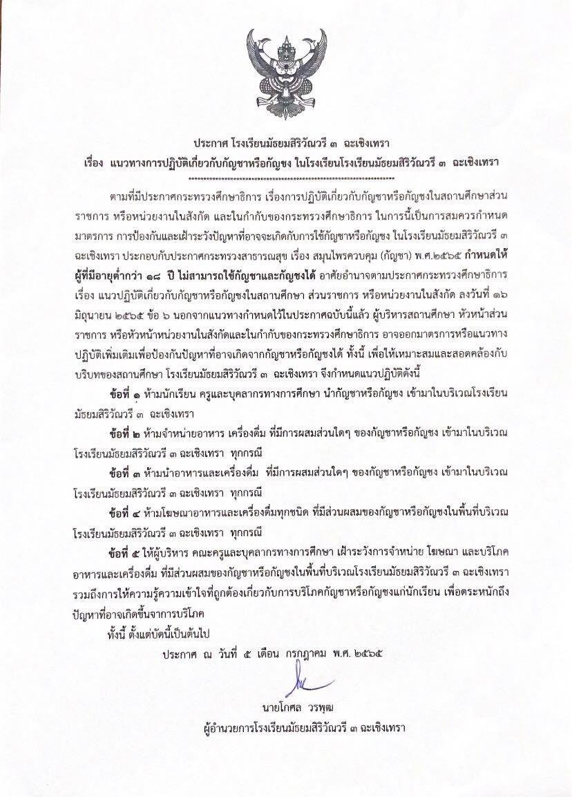 ประกาศ เรื่อง แนวทางการปฏิบัติเกี่ยวกับกัญชาหรือกัญชง ในโรงเรียนมัธยมสิริวัณวรี ๓ ฉะเชิงเทรา