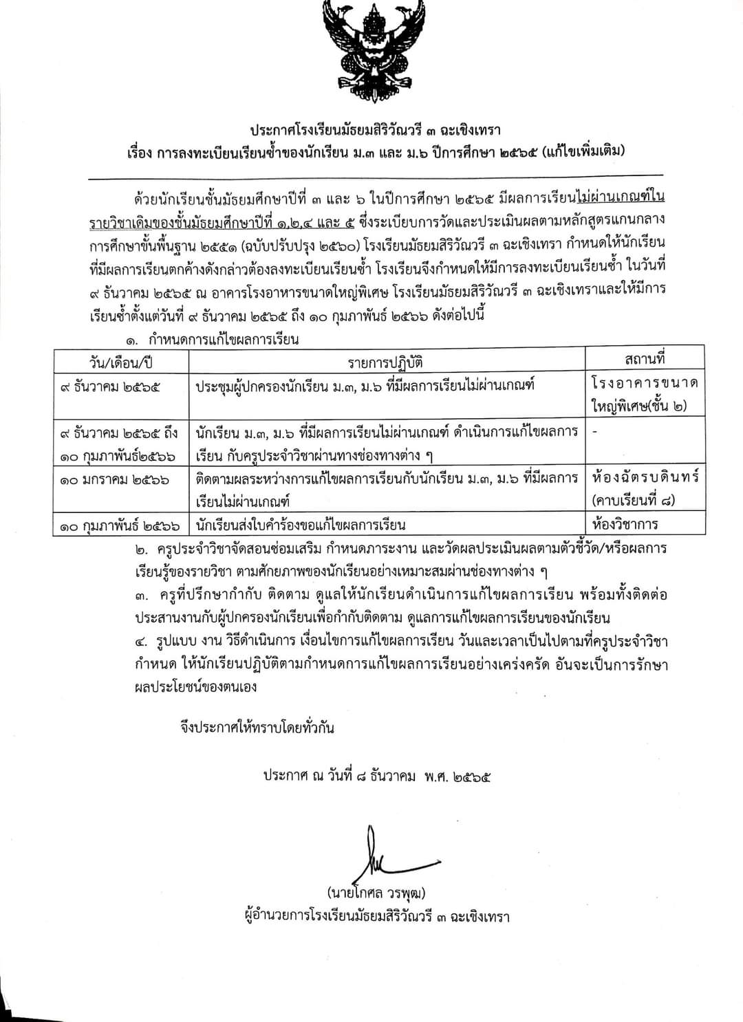 ประกาศเรื่องการลงทะเบียนเรียนซ้ำ ของนักเรียนระดับชั้นมัธยมศึกษาปีที่ 3 และ 6 ประจำภาคเรียนที่ 2/2565