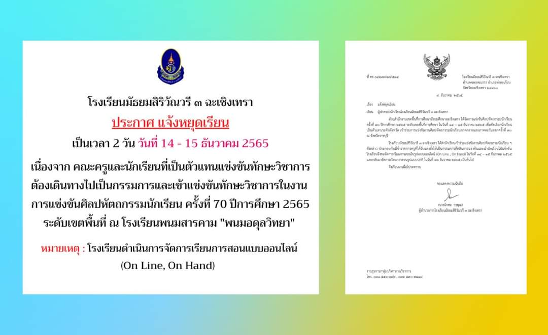 ประกาศหยุดเรียน วันที่ 14-15 ธันวาคม (เรียนออนไลน์)