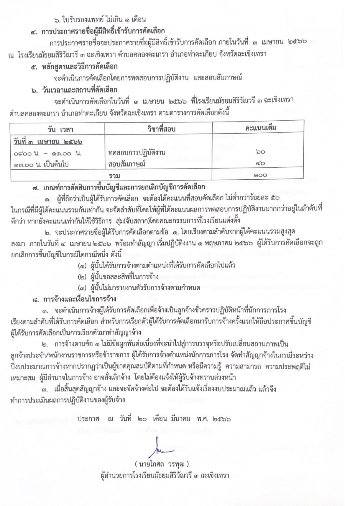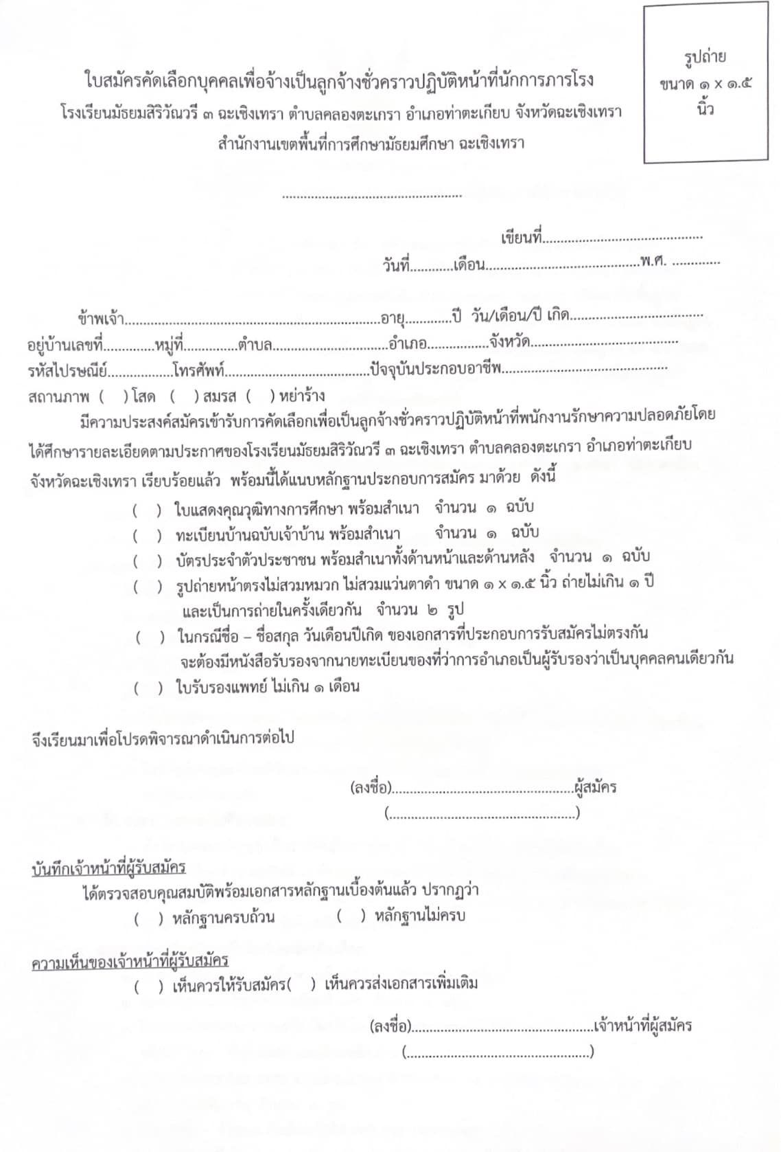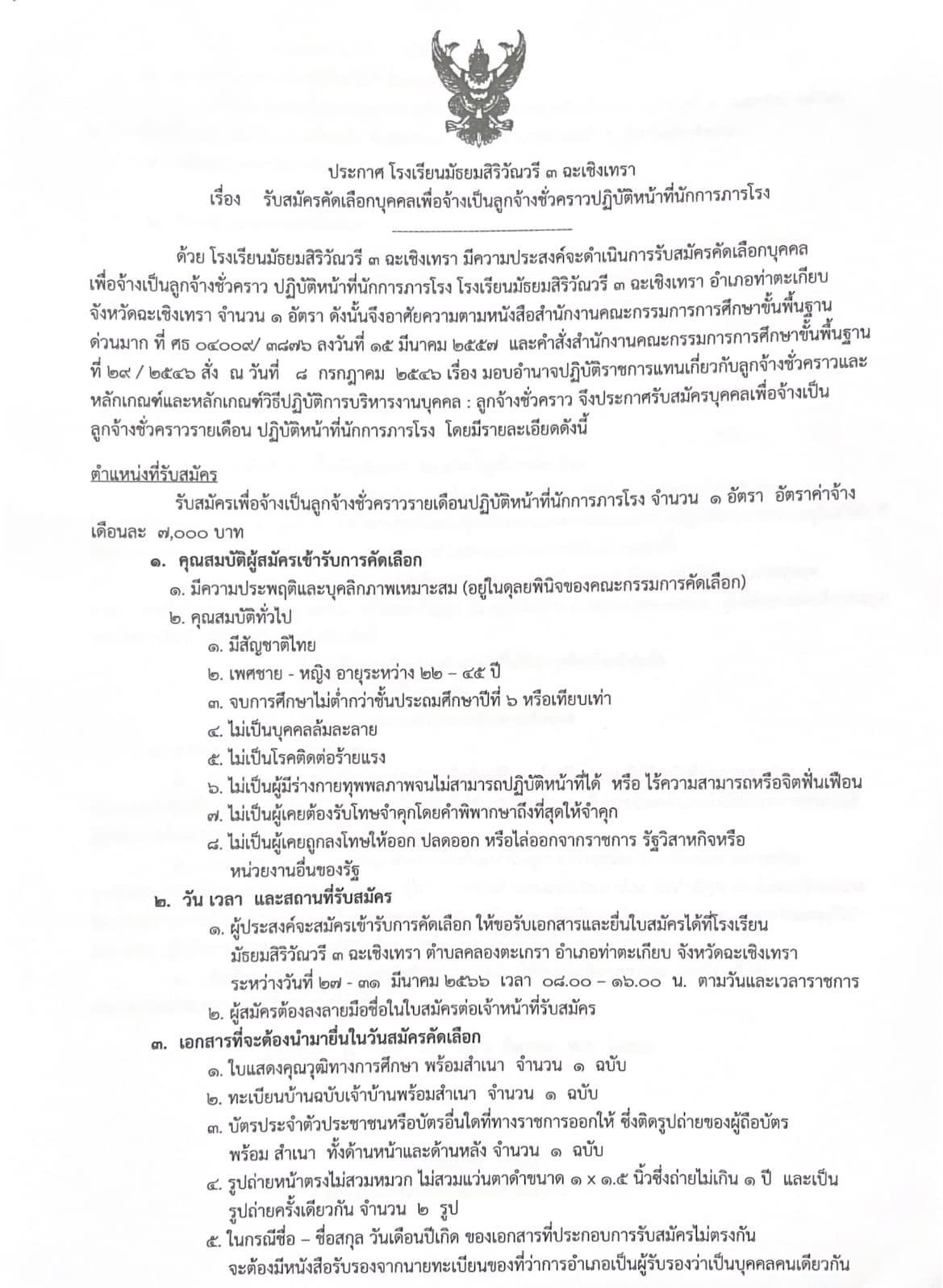ประกาศโรงเรียนมัธยมสิริวัณวรี ๓ ฉะเชิงเทรา เรื่อง รับสมัครคัดเลือกบุคคลเพื่อจ้างเป็นลูกจ้างชั่วคราวปฏิบัติหน้าที่นักการภารโรง