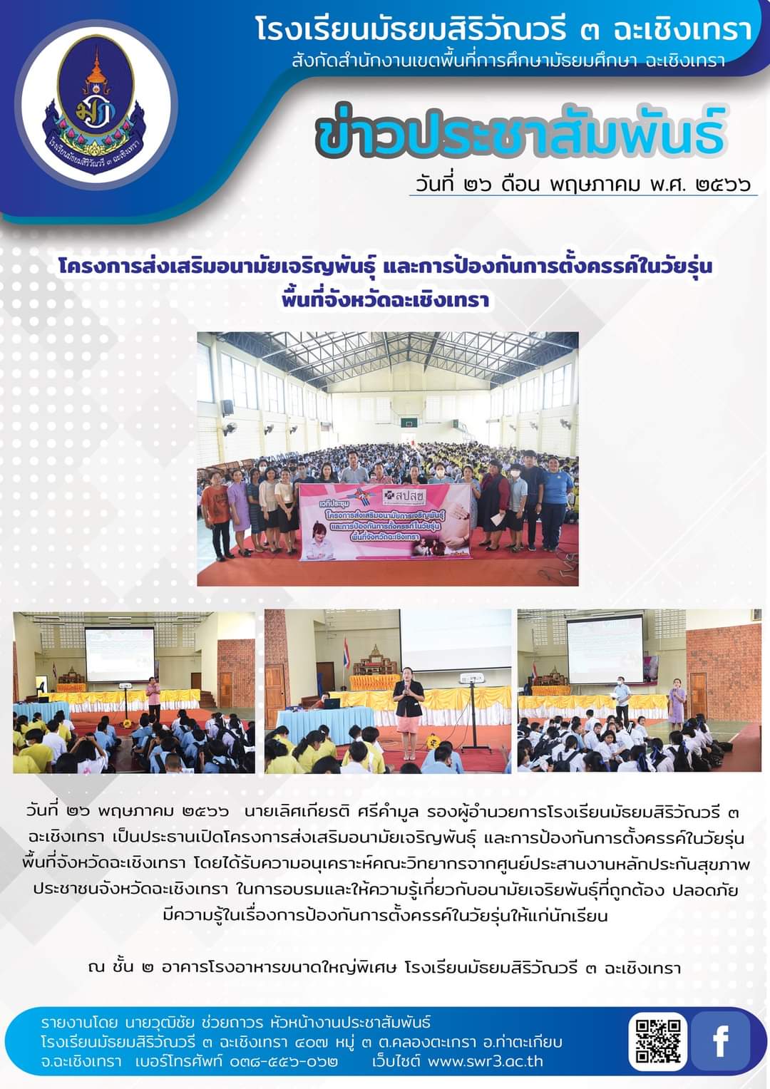 โครงการส่งเสริมอนามัยเจริญพันธุ์ และการป้องกันการตั้งครรค์ในวัยรุ่นพื้นที่จังหวัดฉะเชิงเทรา โดยได้รับความอนุเคราะห์คณะวิทยากรจากศูนย์ประสานงานหลักประกันสุขภาพประชาชนจังหวัดฉะเชิงเทรา