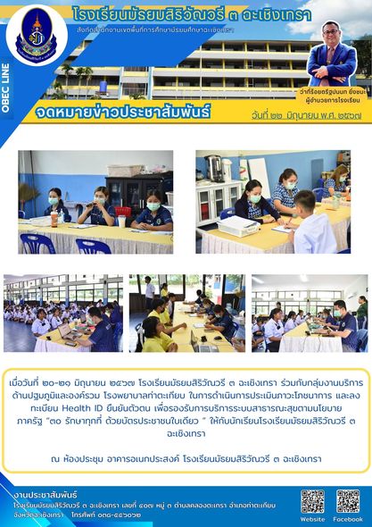 โรงเรียนมัธยมสิริวัณวรี ๓ ฉะเชิงเทรา ร่วมกับกลุ่มงานบริการด้านปฐมภูมิและองค์รวม โรงพยาบาลท่าตะเกียบ ในการดำเนินการประเมินภาวะโภชนาการ และลงทะเบียน Health ID ยืนยันตัวตน