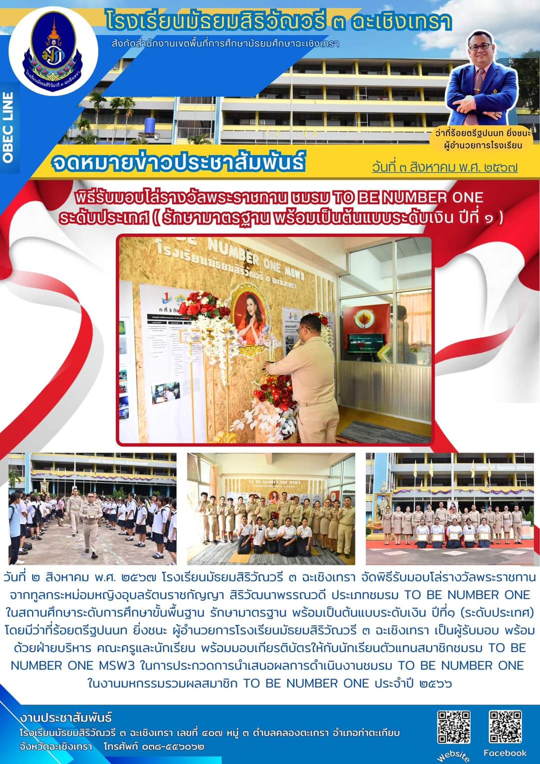 พิธีรับมอบโล่รางวัลพระราชทาน ชมรม TO BE NUMBER ONE ระดับประเทศ ( รักษามาตรฐาน พร้อมเป็นต้นแบบระดับเงิน ปีที่ ๑ ) วันที่ ๒ สิงหาคม ๒๕๖๗