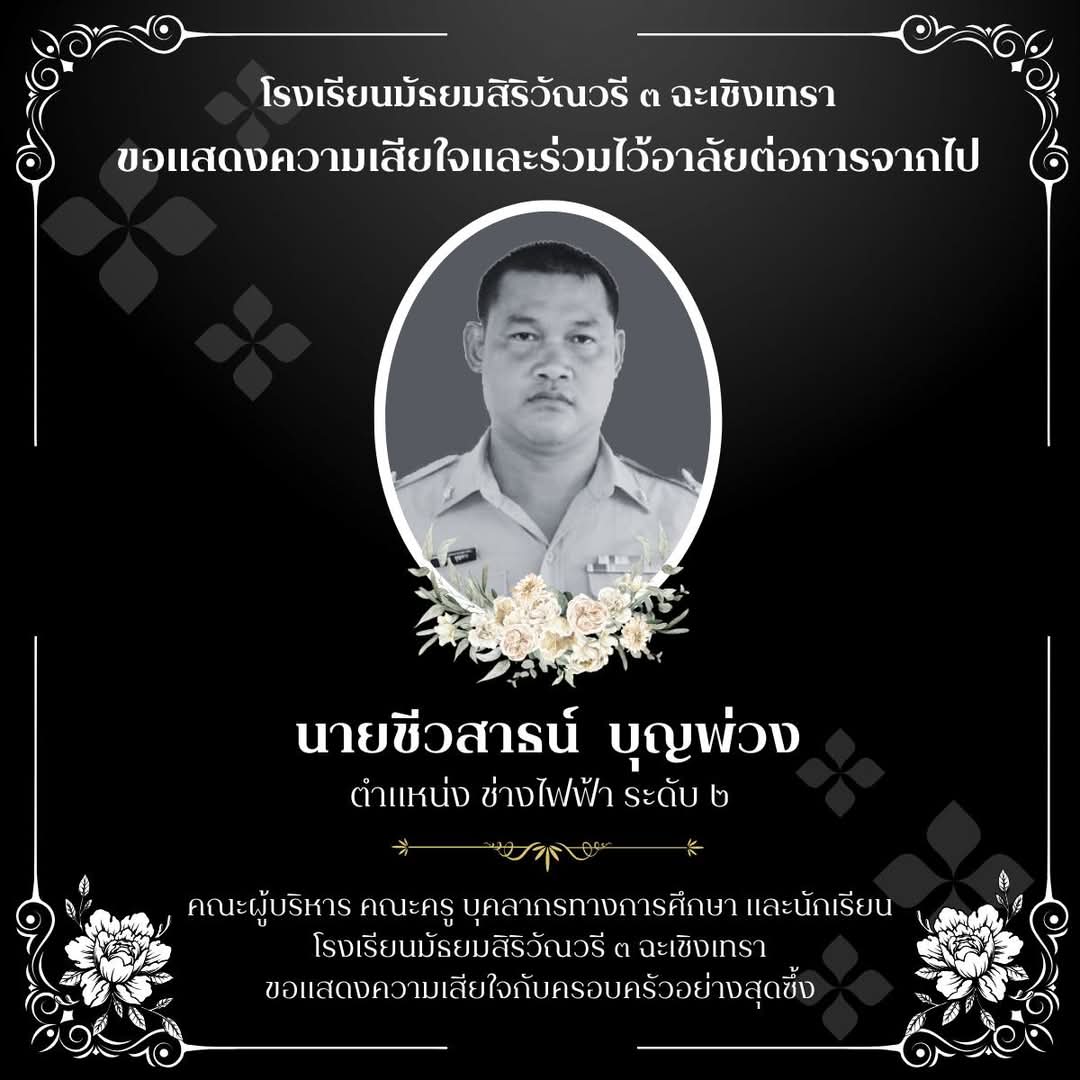 ขอแสดงความเสียใจและร่วมไว้อาลัยต่อการจากไป ของนายชีวสาธน์ บุญพ่วง ตำแหน่ง ช่างไฟฟ้า ระดับ ๒