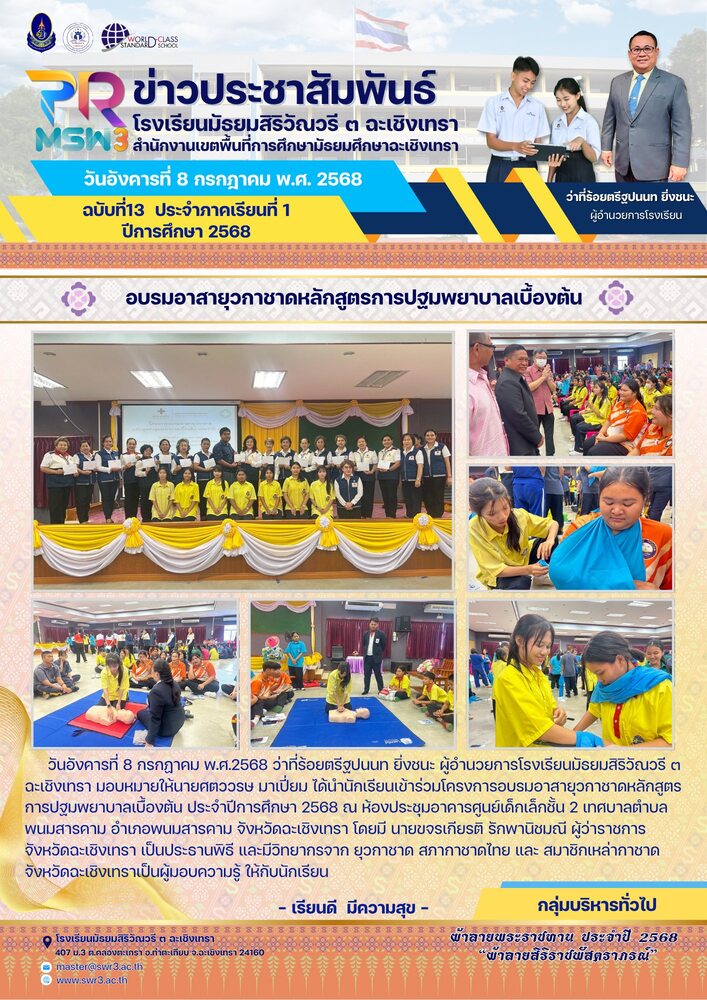 นำนักเรียนเข้าร่วมโครงการอบรมอาสายุวกาชาดหลักสูตรการปฐมพยาบาลเบื้องต้น ประจำปีการศึกษา 2568