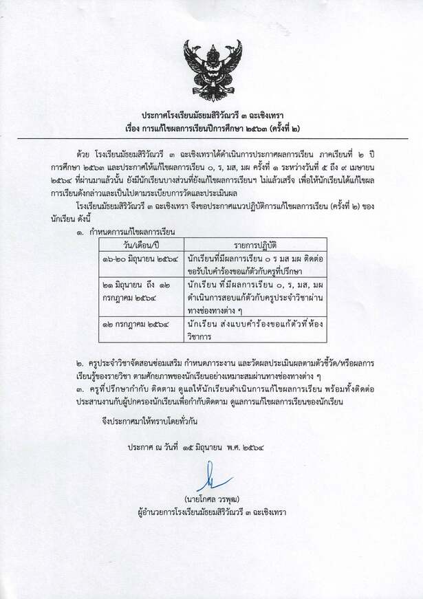 ประกาศ เรื่อง การแก้ไขผลการเรียนปีการศึกษา 2563 (ครั้งที่ 2)