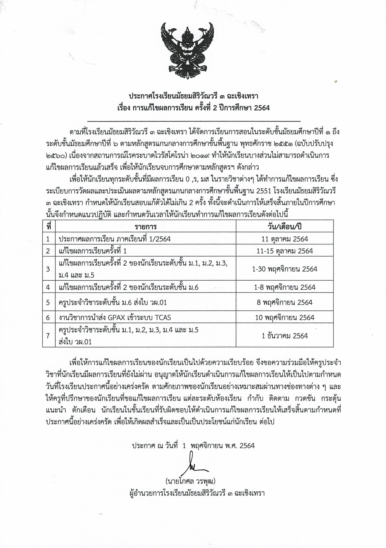 ประกาศ เรื่อง แก้ไขผลการเรียน ครั้งที่2 ปีการศึกษา 2564