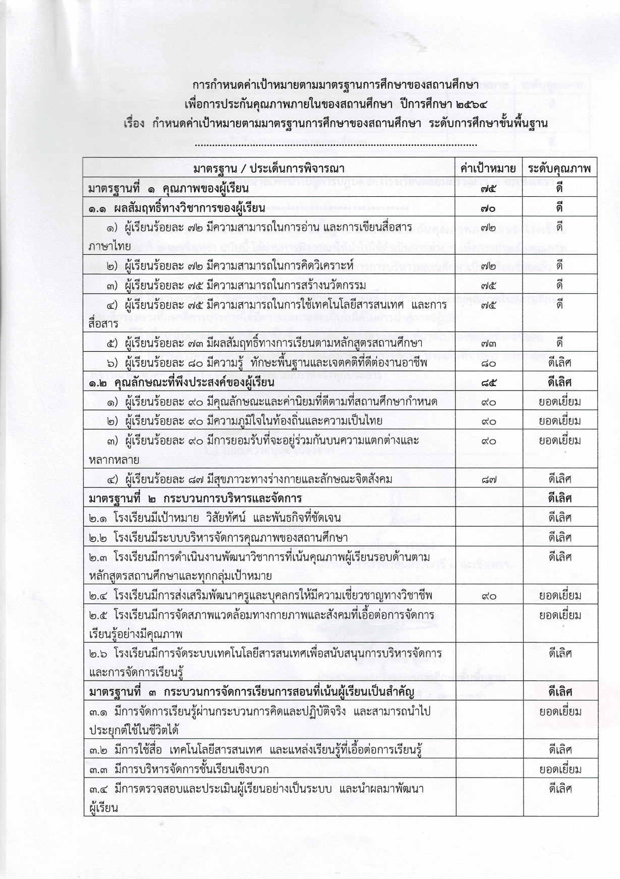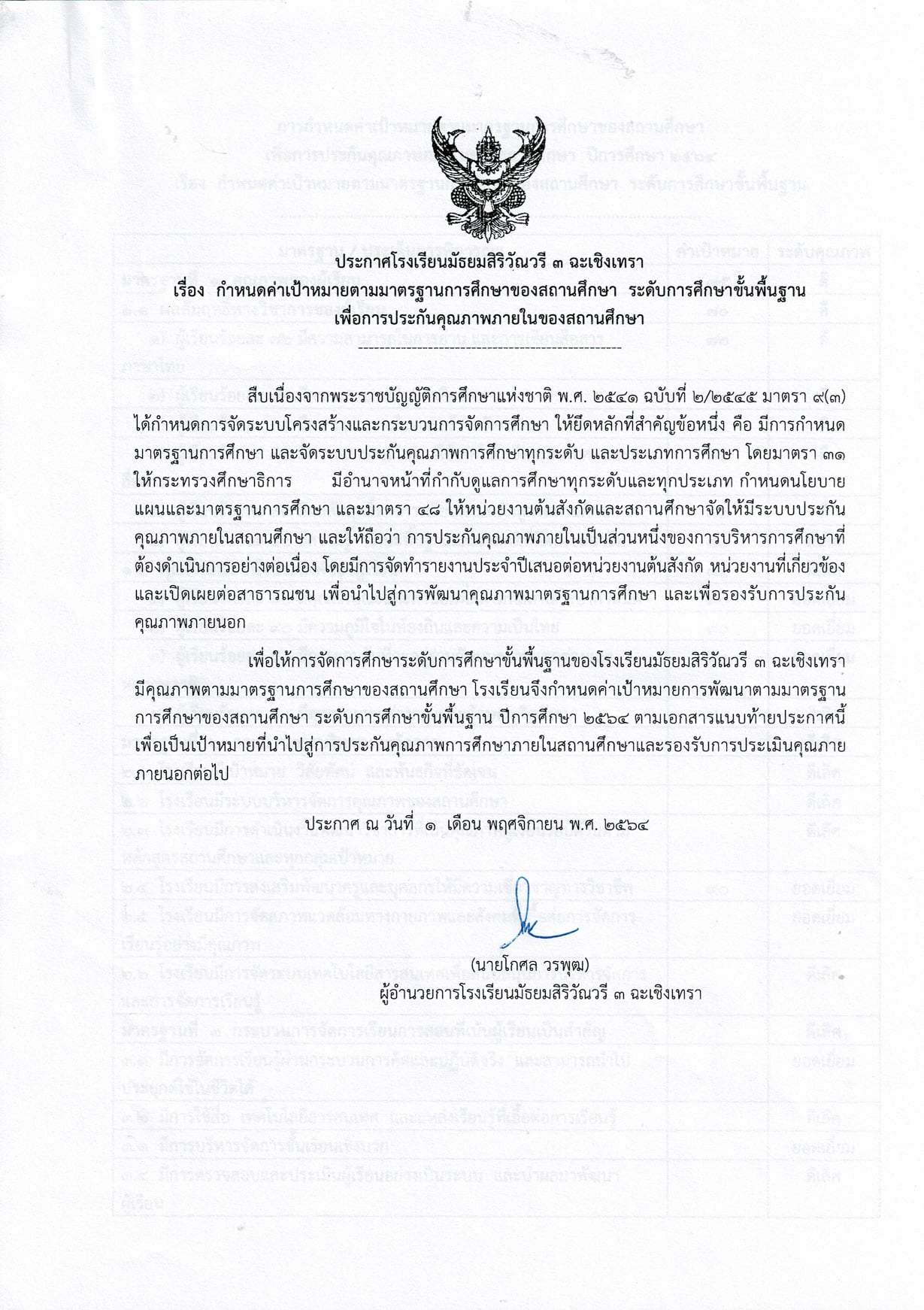ประกาศ เรื่อง การกำหนดค่าเป้าหมายตามมาตราฐานการศึกษา