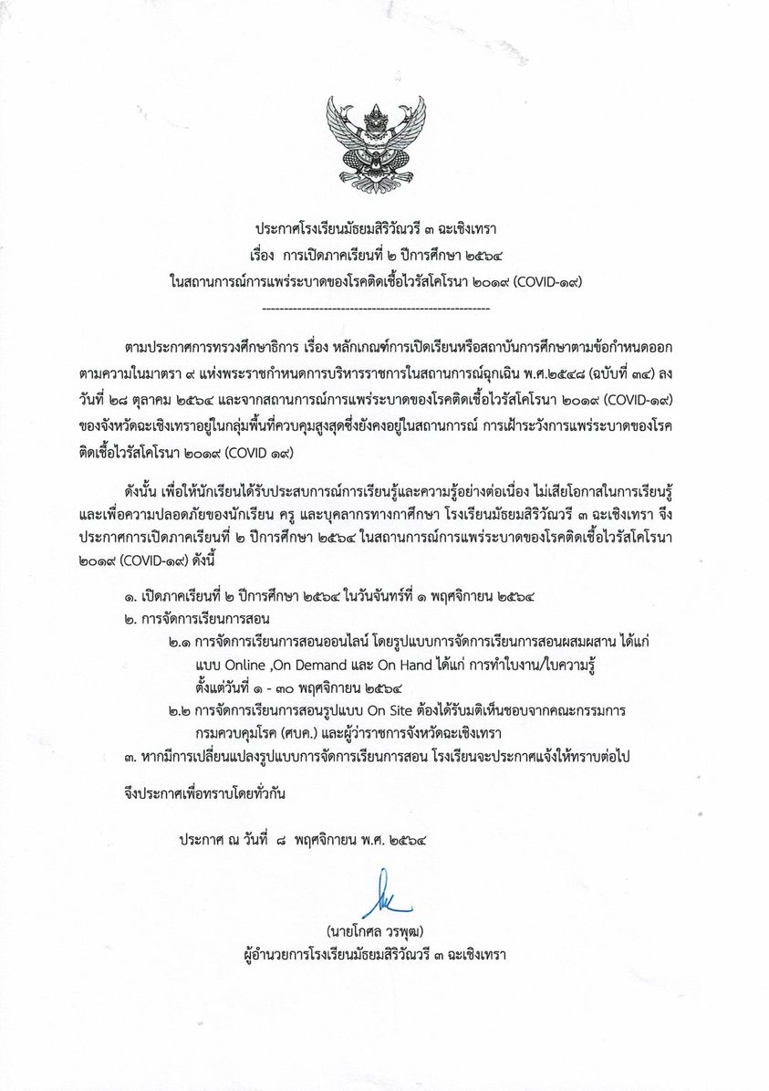 ประกาศ เรื่อง การเปิดภาคเรียนที่2 ปีการศึกษา2564